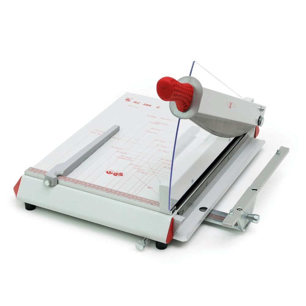Gilotyna RC380 C - profesjonalna gilotyna biurowa o długości cięcia 380 mm, idealna do zastosowań w drukarniach i punktach usługowych. Wyposażona w automatyczny docisk papieru, który stabilizuje arkusze podczas cięcia, zapewniając precyzję i czyste krawędzie.